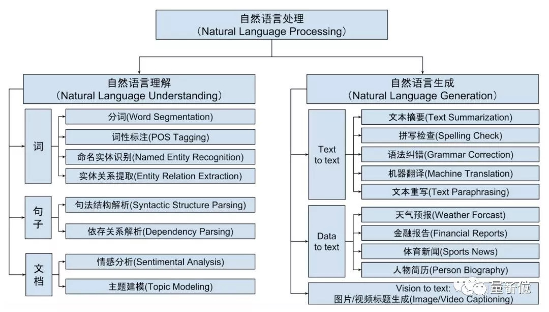 NLP 包含自然语言理解 (Natural Language Understanding,NLU) 和自然语言生成(Natural Langauge Generation, NLG)两个重要方向,如下图所示。