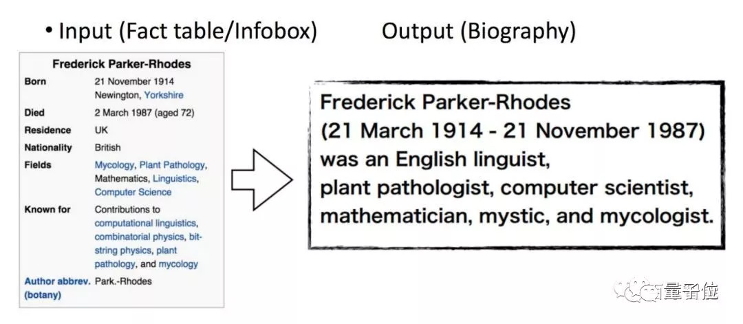 在 Data to text NLG 领域,一项有趣的工作是Facebook AI Research 2016年发表在 EMNLP 会议上的一篇论文研究了如何利用人物的结构化数据(通常是表格化的数据)生成人物 biography 的工作,并通过抽取维基百科的 infobox 和正文第一段话,自动化地构建了一个大型平行语料库 WikiBio,包含了超过70万条平行数据和超过40万的词表。