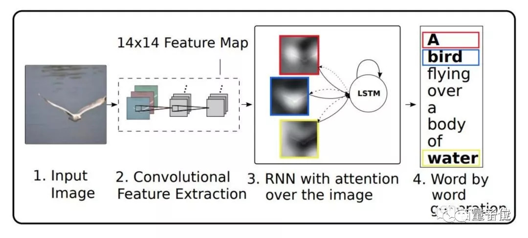 同 GNMT 类似,引入 Attention 机制来智能选择影响 Decoder 部分生成文字的图像空间特征。具体的模型结构如图7所示。