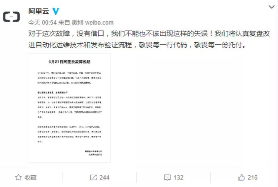 阿里云回应大规模故障:运维操作失误,将认真改进