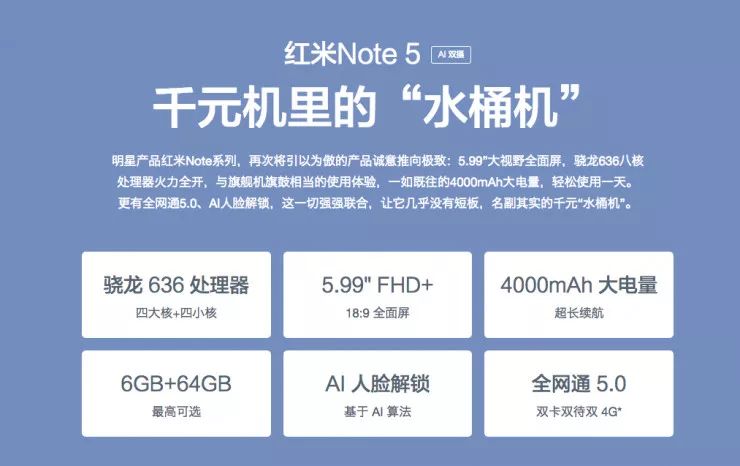 2018 年 3 月 16 日,红米 Note 5 发布,该机采用 18:9 全面屏,全球首发骁龙 636 处理器,搭载 AI 双摄像头,售价 1099 元起。