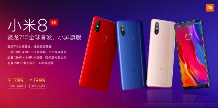 小米 8 SE 全球首发高通骁龙 710 处理器,同样采用“刘海全面屏”,但机身更加硬朗,售价 1799 元起。