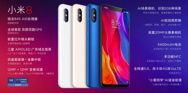 其中小米 8 搭载了高通骁龙 845 处理器,采用“刘海全面屏”,搭载了双频 GPS 技术和红外人脸识别技术,售价 2699 元起。由于与 iPhone X 过于相似,小米 8 引来外界一番吐槽。
