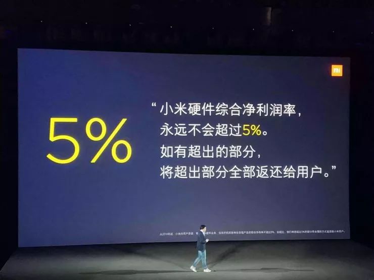 在这次发布会上,小米创始人兼 CEO 雷军宣布小米"小米硬件综合净利润率,永远不会超过5%。如果有超出部分,将超出部分全部返还给用户。"