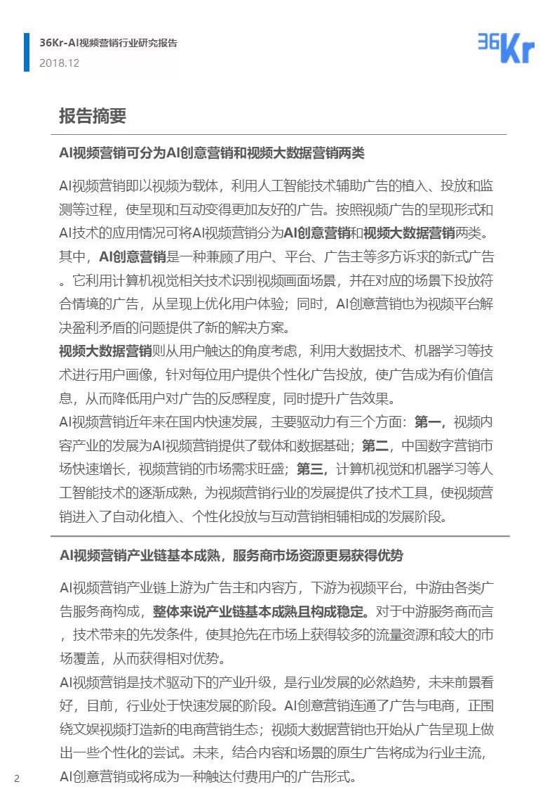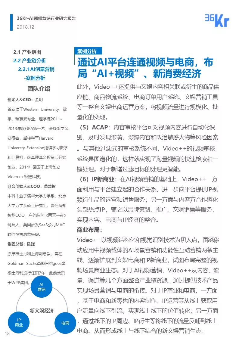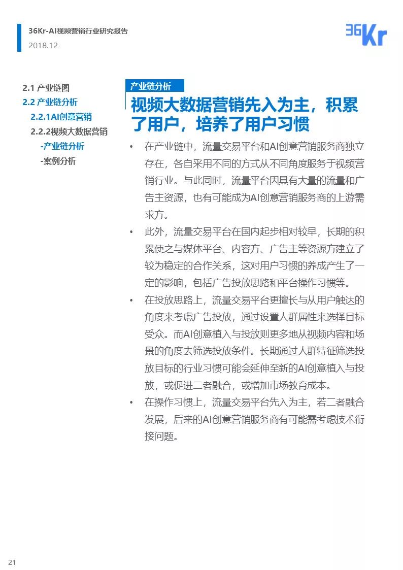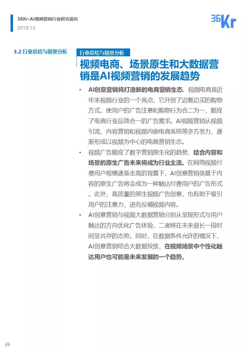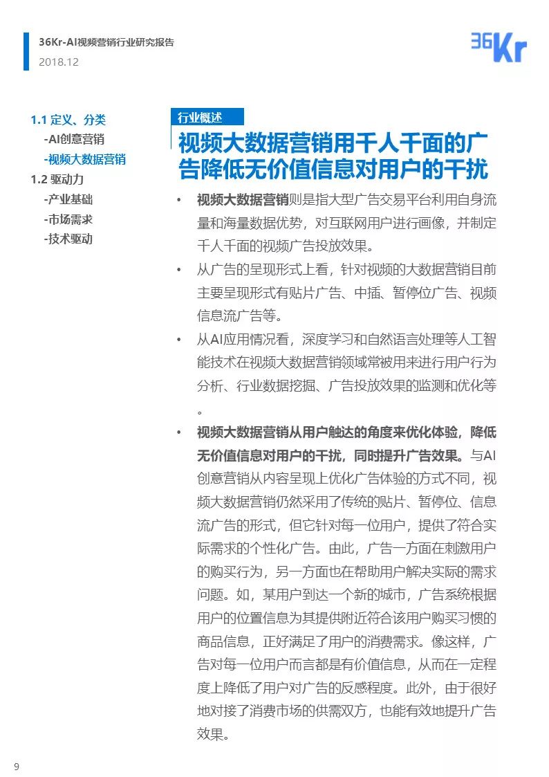 从AI应用情况看,深度学习和自然语言处理等人工智能技术在视频大数据营销领域常被用来进行用户行为分析、行业数据挖掘、广告投放效果的监测和优化等。