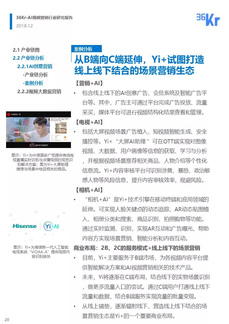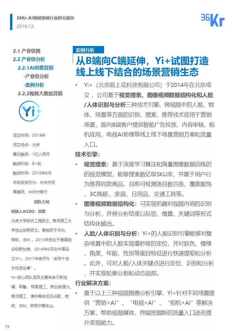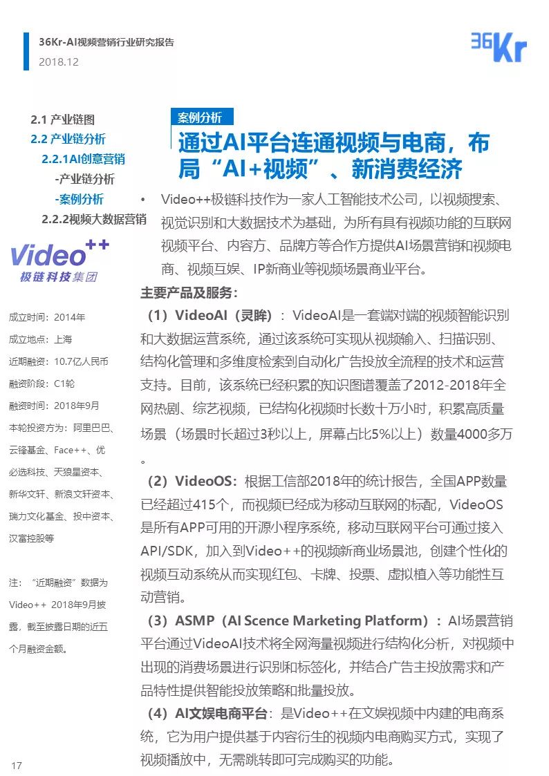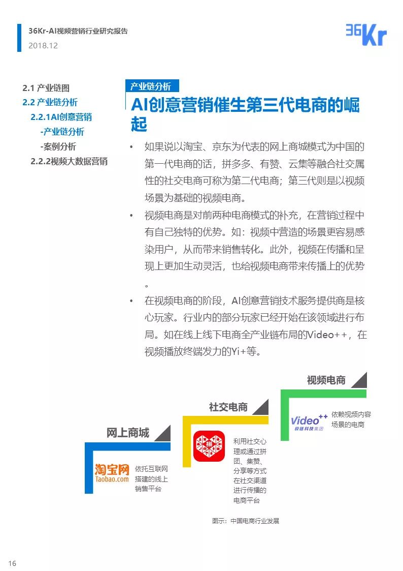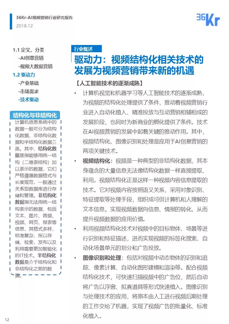 从AI应用情况看,深度学习和自然语言处理等人工智能技术在视频大数据营销领域常被用来进行用户行为分析、行业数据挖掘、广告投放效果的监测和优化等。