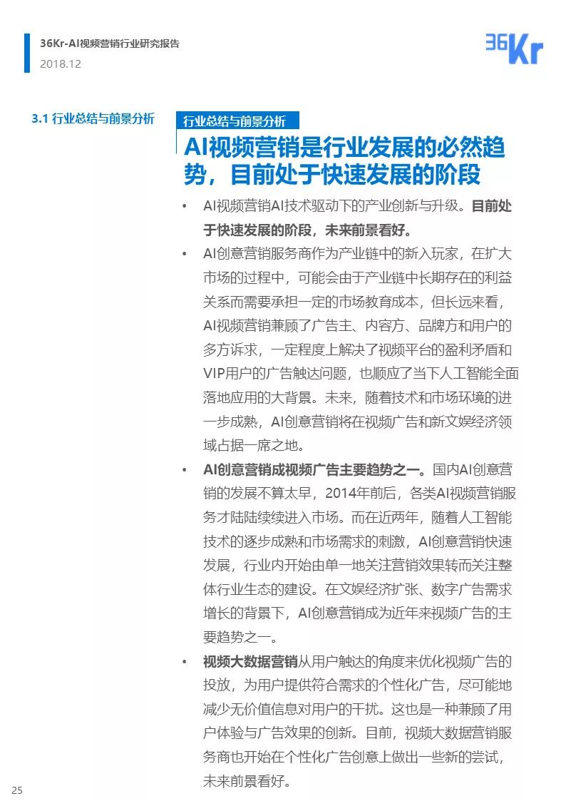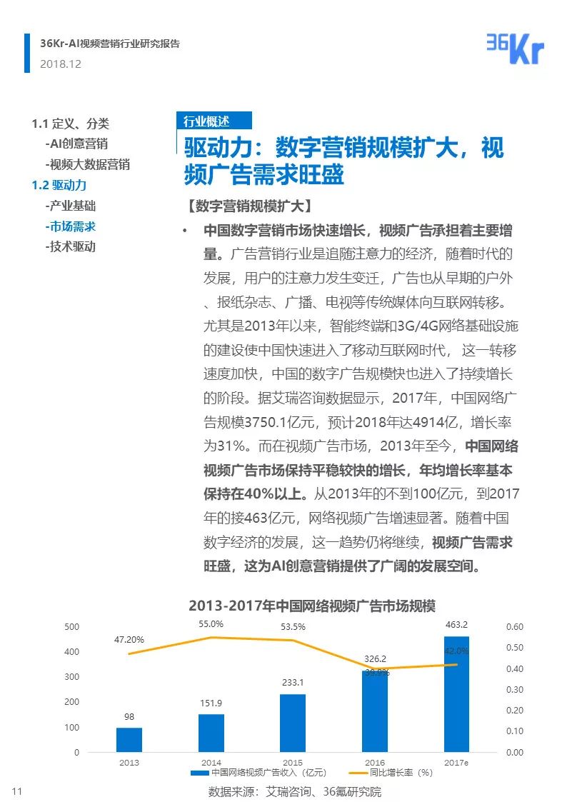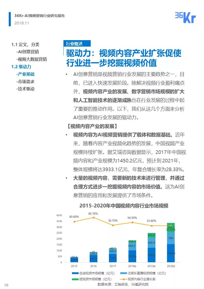 AI创意营销是视频营销行业发展的主要趋势之一,目前,已进入快速发展阶段。除解决视频行业盈利痛点外,视频内容产业的发展、数字营销市场规模的扩大和人工智能技术的逐渐成熟也在行业发展的过程中起了重要的推动作用。