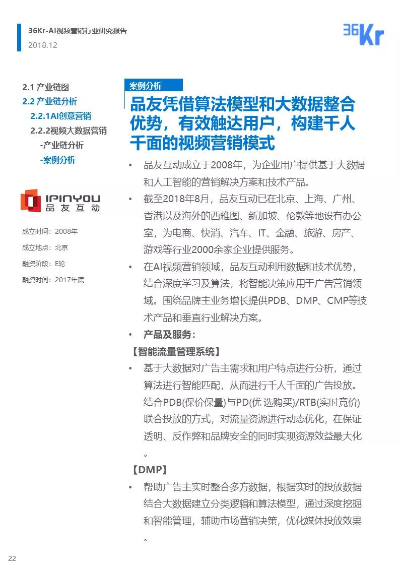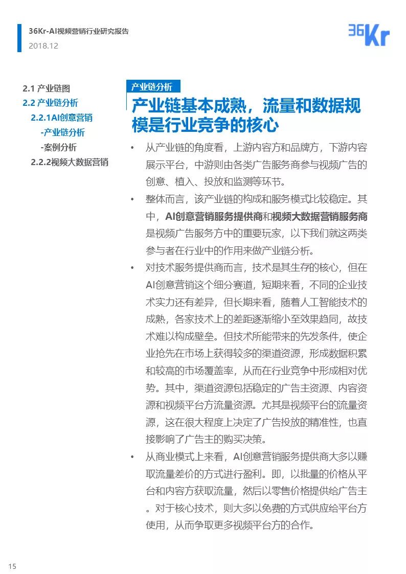 整体而言,该产业链的构成和服务模式比较稳定。其中,AI创意营销服务提供商和视频大数据营销服务商是视频广告服务方中的重要玩家,以下我们就这两类参与者在行业中的作用来做产业链分析。