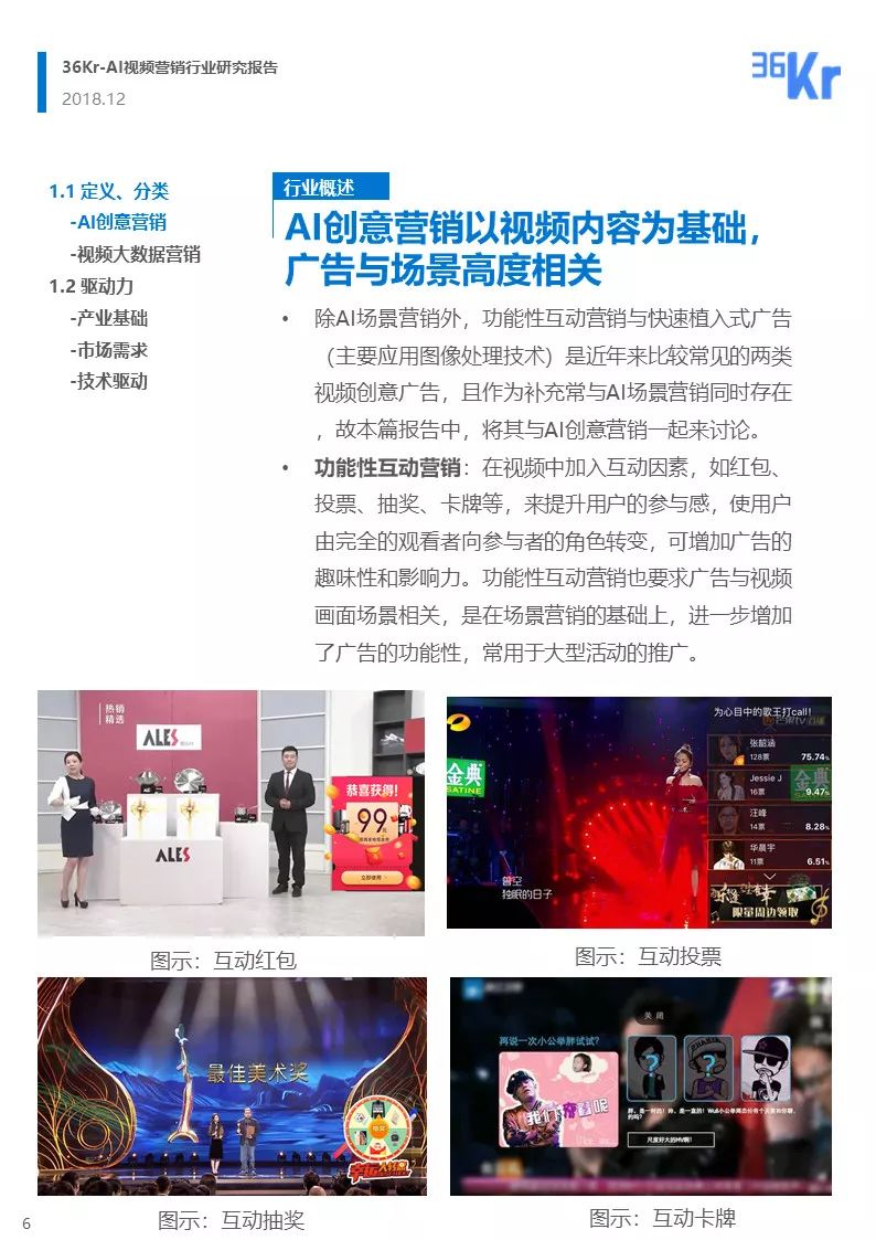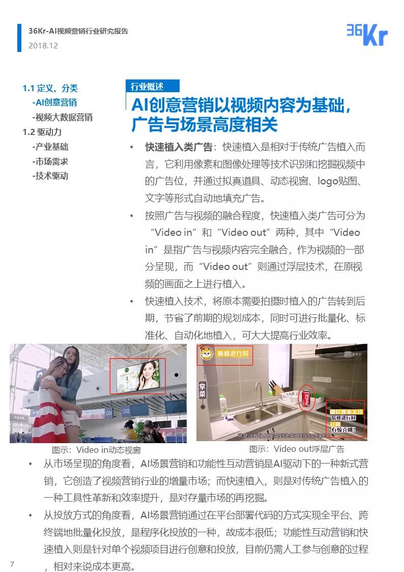 AI创意营销是指利用人工智能技术识别视频内容,然后在对应的视频中投放与内容相关的各种形式的广告。由于广告与视频场景高度相关,故AI创意营销也叫AI场景营销。