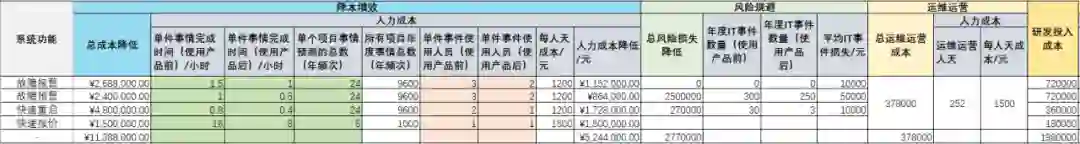 (1)降本=人力成本(发生频率*单个人效提升*人力单价)+ 其他节省(硬件成本降低+软件费用降低)