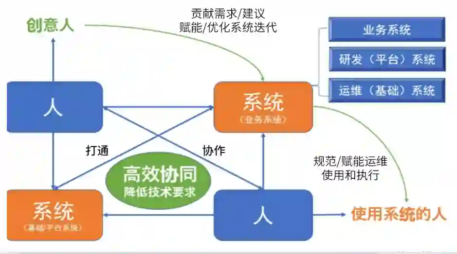 那么该如何破局?据我观察,在此过程中重要的是与需求方反复沟通,如图1所示。把需求方定义为“创意人”,使用工具(系统)的人定义为“工具人”,系统的能力也需要不断迭代提升,当需求方释放能力到系统时,就可以有更多时间来学习,并持续不断地输入需求、优化系统。实际上系统是依赖他的,而不是完全取代他。从效果看,部分人能够接受,部分人还在顽强抵制。