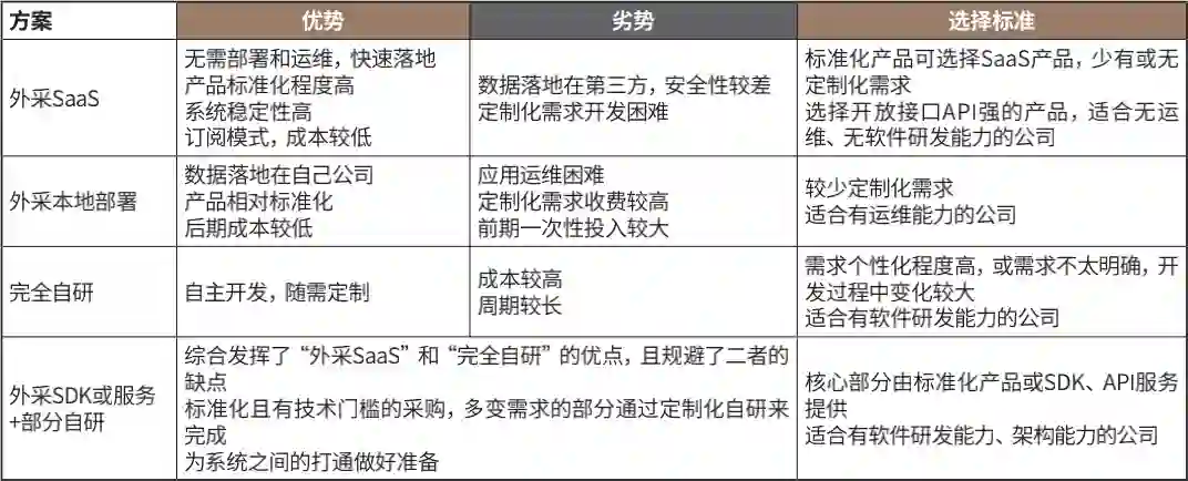 对于上述四种方案的选择,负责数字化转型技术的团队或决策者一方面要了解行业产品的发展动态,另一方面要了解自身的技术实力或专长,用最小代价、最小风险及最快速度满足业务需求。我的分析和选择标准见表3。