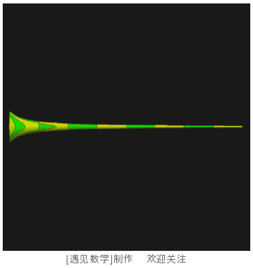 这个图形的特点为体积有限,而表面积无限。大家能从图中体会到这一点吗?或许会略微有一些难度吧。