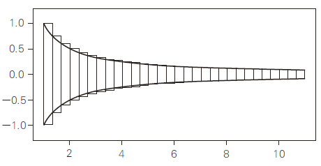 首先,给出一个无线延伸的反比例函数曲线 y = 1/x (图 102)。可以观察到当 x = 0 时,y 的值是趋近于无限大的,因此为便于论证,我们以 x = 1 为节点,对这条无线延伸的曲线进行截取。这样就可以得到一条极度细长的曲线,这条曲线是向坐标轴右侧无限延伸的。当然,图 102 中只给出了这条曲线有限的一段,理论上,完整地呈现出来的话应该是像一条无限延伸的细长尾巴。