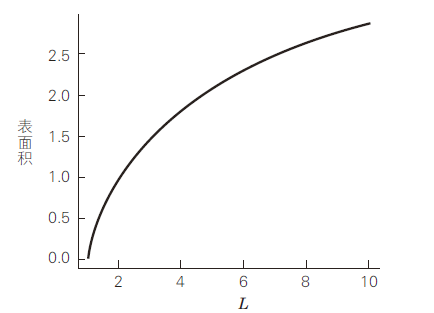 可以看到,与图 106 的曲线,也就是小号体积随长度变化的曲线相比,随着长度的增加,表面积增长的幅度更为剧烈。不过,从这个结果也还是无法明确得出小号的表面积是否真的是无限大。