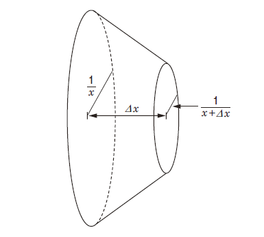 以上仅是一个近似的示意图,如果能够将 △x 的值缩小,那么把所有这些切割出的圆锥台的表面积相加,不就可以得出托里拆利小号的表面积了吗 ?