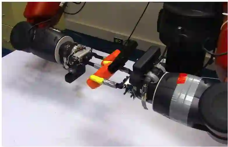 CMU 和谷歌研究者正在使用基于博弈论和深度学习的对抗性训练策略来提升操作性任务,如抓取物体。对抗者(adversary)可以是一个机器人,其会尝试破坏另一个机器人抓取物体(如下图所示),同时对抗者也可以是双臂机器人中的单臂,其尝试干扰另一只单臂抓取物体。