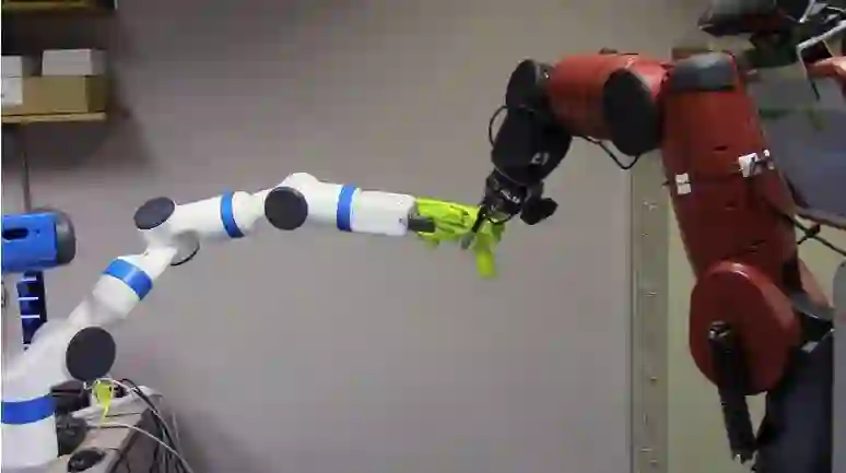 机器人抓取臂和对抗臂:该 Baxter 双臂机器人其中一臂努力抓取物体,而另一臂尝试拉拽物体而破坏平衡性。