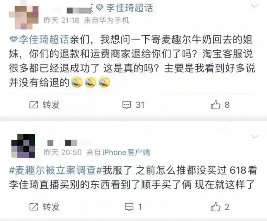 2021年双11及今年618,麦趣尔牛奶都曾多次登上李佳琦直播间,是零食饮料品类的畅销产品,而现在,即使李佳琦停播快一个月,这群消费者也正在“绑”着李佳琦,焦急地等待退货消息。