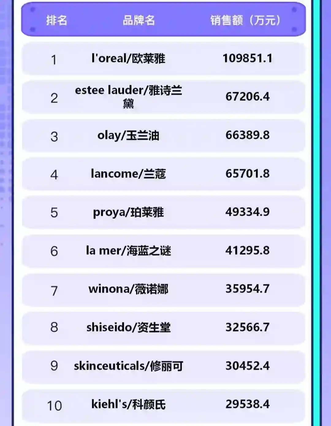魔镜市场情报数据显示,截止6月16日,欧莱雅、雅诗兰黛、玉兰油分别以10.98亿、6.72亿、6.64亿元的销售额居于天猫美容护肤榜单前三,其中国货品牌仅有2名挤进榜单前十,珀莱雅、薇诺娜分别以4.93亿元、3.59亿元的销售成绩拿下榜单的第五、第七。