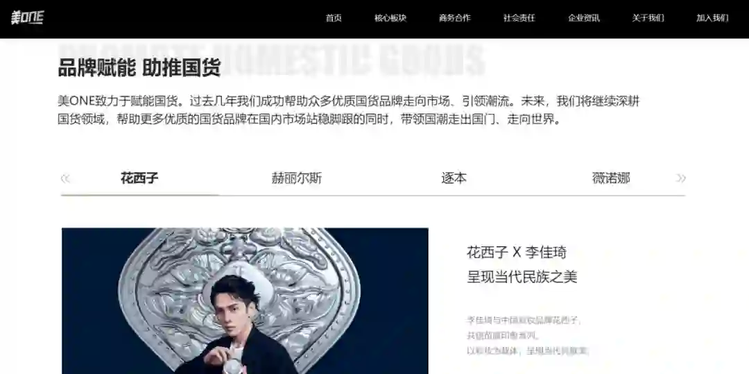 在美ONE官网的品牌共创板块,清一色出现的都是李佳琦推荐的国货美妆品牌。