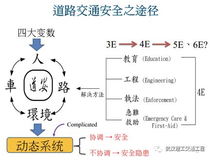 好,再看。我们讲交通安全四大变数,你看,刚才讲人车路环境对不对?道路安全它是一个动态的系统,那么这四大变数如果是协调的话,那就是安全。如果任何一个不协调,那就有安全隐患。四大变数,它是一个动态系统,动态的比较不容易掌握了,静态的比较容易掌握。那么我们怎么去解决这个,你看你要透过教育、工程、执法,还有急难救助。