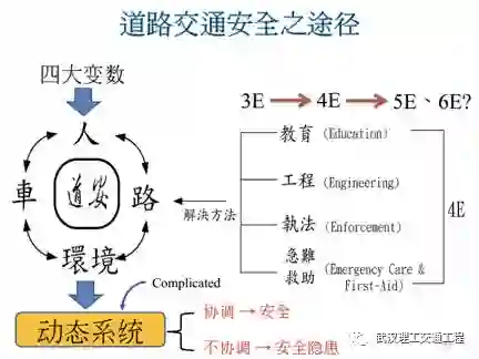 我们早期的交通工程强调,前面三个E,那么后来为什么会有第四个E?道理很简单,因为很多的事故,差不多严重事故有一半的人是当场就挂掉,5分钟之内亡了。但是有三成到四成的人是几个小时之内死亡的。你看我如果可以紧急的救助这些人的话,那么这些人不至于死亡。这就急难救助,那么现在新型的车子,有一种所谓的急难救助系统是什么意思?我们说某某一个人他开车,那么这个车子只有他在车上,就他一个人,车子掉到山底下去了。因为他本人昏迷了,他没法报案了。那这怎么办?他的车子会帮他报案,因为他的车子已经可以侦测出来,这是车上的系统。这个时候急难救助,然后就报完之后,它的附近的救难机关就会来了。所以说你看,环环相扣。所以说交通安全,它不是高科技,但是它很复杂,它的面向很广。所以这个你看起来没什么,可是他问题很多,包括教育,从小开始就要教了。教育包括家庭教育,父母亲要教小孩,还有学校教育,老师要教学生,对不对?还有国家的一般社会教育,像什么,电视上是不是有一些广告会叫你行车注意安全等等,那就是社会教育。