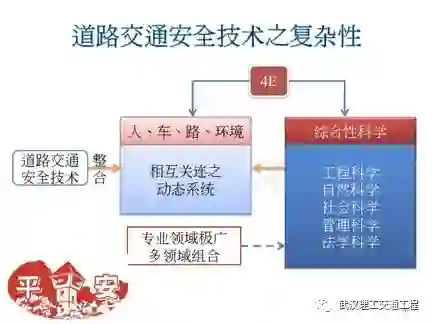 再看看这里。那么我们看道路交通安全,它那个技术很复杂,为什么他复杂?因为它是个系统工程,而且是动态系统。你看他是你要算是个综合性的科学,你不只是有工程科学,还有自然科学,有物理化学等自然科学,还有社会科学,我们刚讲过执法。执法有没有社会科学?有。还有你怎么去管理的科学?我昨天跟各位举例子,任何一条道路旁边的树木,它都有身份证的,所有的杆子它都有号码,他都有身份证。任何一座桥,哪怕一根桥墩,它都有个身份证的,这身份证就记载这座设施的前世与今生了,哪一家厂商做的,什么人负责管理的,它是什么材料做的,什么时候该维修,这个树什么时候该施肥了,统统有,就是所谓的管理。