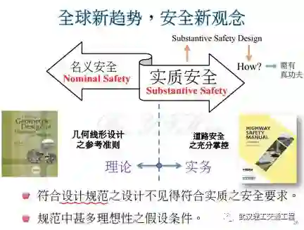 好。那么这个我应该跟各位讲过,我再重复一次,名义安全是我们基本具备的,你只不过是只是具备,你只不过是符合设计规范的,这是理论的,理论上我有名义的安全。但实务上你不见得有实务安全,为什么?所以说我们刚讲了,我设计规划设计不见得符合实质的安全,所以说才会这个,实质安全。这本highway safety manual,我是觉得咱们国家可以去研究可以去开发的,这个很重要,这么大一个国家可以做的,值得,highway safety manual,你去教那些工程师怎么去注重安全。你看,规范中有很多的理想性假设条件,所以说这也是名义安全,因为道路上不可能那么理想,所以说才有实质安全。