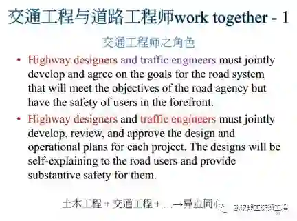 再来看,交通工程师的角色,我们知道,交通工程师跟道路工程师一直有争议,我们看看美国的交通工程师特色,好,你看,这个是你看NCHRP报告里面写的,你看,highway designer是什么?设计道路的设计者,跟交通工程师你看他必须怎么样?jointly就是合作,必须合作去研发,而且要互相认同对方的一些理念,所以说你看设计道路的跟交通工程师两者是怎么样?异业同心呐。你看在美国交通工程师地位比道路工程师还高。道理很简单,为什么?我们这条道路花了100亿,结果95亿统统是土木工程,只有一点点的钱是交通工程,但是我这一点点钱的交通工程如果不做的话,这条路开通之后你就完蛋了。你可以想象吗?这条路是100亿盖好了,外形统统有了,这个路面桥梁装好了,结果交通功能统统没有,没有标志,没有标线,什么都没有,你敢通车吗?绝对不敢,但是交通工程的费用只有在里面的10%不到,那谁重要?当然是交通工程师重要,知道这意思吗?各位同学知道这意思什么?现在看在美国交通工程师是很有地位的,了解吧?在美国上过班我很清楚,比设计道路做线形地位还高啊。那个地方的首长最怕红绿灯出状况,了解吗?很重要。所以说要异业同心,所以说交通工程师要有他的角色的。台湾有交通工程技师,美国也有交通工程的PE,我就是美国的PE。