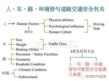那么环境你看天气、执法等等,对不对?所以说会造成你的行车环境变化多端。所以说你看这个人车路环境都有可能是安全隐患的来源。那么这里面这个最重要是什么样?四者有它的专业,而且要怎么样?你怎么去了解他之间的互动关系?比如说我们讲最近的兰州收费站那个交通事故,你看他主要是车辆的议题,你做路的他就搞不懂。对不对?所以说你需要一个团队去研讨,了解吗?好,你看搞车辆的他不懂路,做路的你搞不懂车辆。像这些,通通是一体。