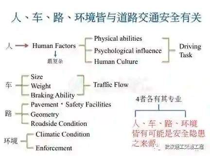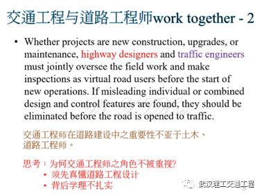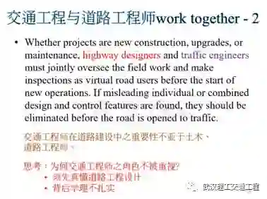 再看这句话也是一样。所以说我们来思考一下,交通工程师是在道路建设中的重要性不亚于土木、道路工程师,这点各位一定要记得,但是在中国大陆我觉得目前还没有很突出,很明显,事实上你要跟国外一样。那我们来思考一下,为什么交通工程师不被重视?道理很简单,因为我们的很多交通工程师没有土木的背景,所以说你一定要有土木背景,但是我们的土木背景不是真正的土木,只不过是你要知道土木的一些相关的东西,了解吗?譬如说我们很多的道路工程、交通工程师,他设计的常常会被学土木的嘲笑,他是有原因的,因为你不懂土木。我举个例子,台湾有一条道路在下坡路段,结果它的护栏做的太低,不能做太低,那个护栏是交通工程师决定的,所以说读土木的就会嘲讽他,为什么?下坡路上护栏做这么低,车子撞上就会翻车了,了解吗?可是规范没有规定,规范规定的是比较矮的护栏。了解吧,这都是问题。所以说你看,你要先懂道路工程设计,就我们讲的前面那些你要懂,尤其是要懂几何设计,公路几何设计。还有很多交通工程的工程师,他背后学历他不扎实。我常跟学生讲,交通工程设计背后的所有的东西,一草一木背后都是有原理的,都是有原因的,所以说我们昨天看为什么信号灯绿灯倒数不用,因为绿灯倒数很多状况都剩下两三秒时候,那么从五降到三跟四的时候快结束了,冲啊,结果产生更严重的事故。所以说绿灯倒数现在已经没有人用,就是这个原因了。那么我们如果要去强调秒数倒数的话怎么办?人行倒数最好要有,因为行人是最弱势的,再来是红灯倒数,那么绿灯倒数不要用,它有一个原因的。你要记得交通工程设施背后、任何的设计背后都有它的原理、调查依据,那么human factors是很大的依据原理。