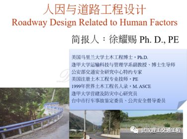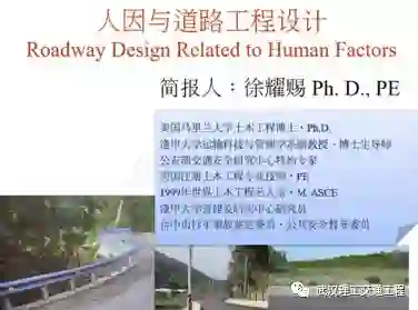 徐耀赐:大家早上好,今天跟各位汇报这个议题,你看这个人因与道路工程设计,这里面人因,基本上就是人,而且这个人是正常的人,一般的,我们所看到一般的人,所以说一些奇奇怪怪的,比如说他有精神疾病的,他有特殊状况的,不要考虑,因为不在我们的范围,所以说叫人因。人因这个单词,human factors,你如果去找一下医学上有很多这种相关的名词。不过我们这边局限在跟他的驾驶相关上面而已,其他的我不管。human factors就是所谓的人因。