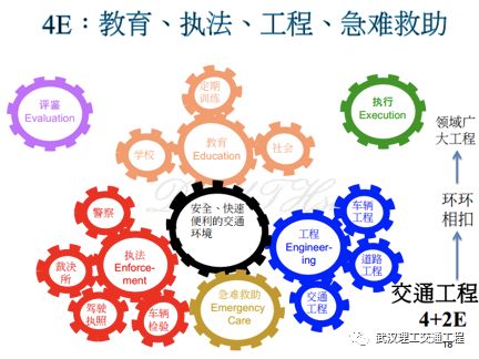 再看这个四E,交通工程里面4E,我们讲过教育、执法、工程跟急难救助,那么这个是中心,我们是交通安全中心。你看,有教育层面。你看,有些大货车司机要不要进去训练?要的。第二个,那么要不要社会教育?要的。那么要不要学校教育,这是教育层面。再就是工程层面。你看有道路工程,有车辆工程,还有呢?还有交通工程,你看这些都是一体的,都是挂钩的,你看这个图上有说它们是环环相扣的,一个扣一个,你只要这里面这个词只要一个删掉了,一个松了,其他就没有用,那么这个是执法层面。是吧?前面你看交警,还有它的执法层面,还有驾驶执照车辆检验等等。还有急难救助。总共这四E,它的领域非常广,他是个大工程,你看环环相扣,交通工程。那么另外两个领域有人说是什么?一个是评鉴(评估),我这个事情做的好不好,我怎么去评鉴,怎么去维权,这个在大陆目前没有,这在美国现在已经有,台湾都学美国的,这个是我们可以去学习评鉴。那么怎么样?我这个做好之后,我怎么去执行,执行好,执行方法不一样,效果会不一样,像这两个是可以加载原来这四个里面,像这些都是可以好好做研究。