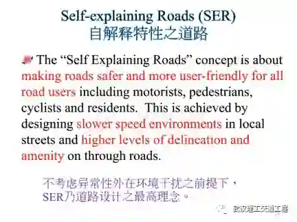 我们再看这里,看看这句话,什么叫做SER?自解释的道路Self-explaining road。自解释道路,我们如果用这个原文,我们如果用中文来看它的重点是怎么样?你看不考虑异常性外在环境干扰的前提下,SER是道路设计的最高理念,什么意思?我在路上走路,我很自然而然的知道这是路,我知道怎么走,我开车在路上,即使没有标志,我也知道路是怎么样子,应该怎么走。就是说,你看,这个路它本身就是很清楚地表明它是什么样的路,了解吗?你们看有一个人走在路上,你只要看这个人的动作,他的行为举止,你大概就可以判断这个人的身份地位,这个就是自解释的概念,了解吗?今天一个蓝领和一个白领走在一起,你可以判断出来,因为人都有自己的社交现象,可以了解,是不是?