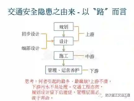 再我们看交通安全隐患的由来,如果是单独探讨路,你看我们从规划、设计、施工一直到管理营运维护,你们思考一下,哪一种,何者引起的最多、最麻烦?答案是上游,你的规划设计不行了,后面就很麻烦了。这些的问题。对。我们的都市计划做不好,你都市交通一定不好。一定的。对不对?你看你小学读不好,初中一样都不好,初中读不好高中都读不好,你就别上大学。它是连贯性的,所以说一定要抓上游,了解吗?我们如果把雅鲁藏布江把它给封掉了,下游恒河就没水,了解吗?这个要抓上游。所以说交警在底下,上面做不好,你交警永远忙翻天了。要了解,所以说我们现在都没有做系列的思考,一定要从上游做起。所以说你看,一手的规范,它为什么那么注重?因为上游不好下游就麻烦。所以说这是值得我们学习的。那么这个设计,你看有初步设计,有细部设计,设计之后,你要交给第二者、第三者再去帮你检查,因为人都会有犯错?初步设计再到细部设计。我在台湾地区看过很多人设计,但有些图例翻开,几公里路,我就可以把它写出几十个缺点。为什么?因为设计人搞不好,没有想到这么多。所以说你看,做交通工程,就看他年纪,年纪越大经验越多,因为都是累积出来的,跟一个人的社会经验一样,你说一个20岁小伙子哪会有社会经验,但是一个老先生他就有社会经验了。