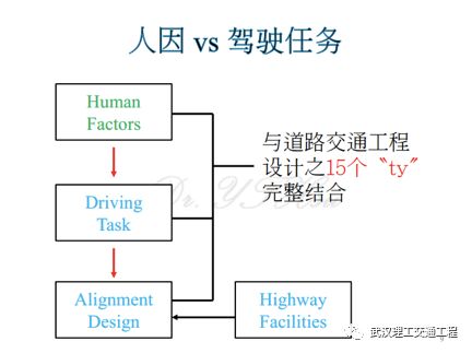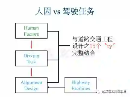 那么我们怎样把human factors,跟15个-ty结合在一起,道理很简单,因为human factors是人因的,任何人,他开车的时候,他会争取所谓的driving task,我不知道有没有跟各位说过我们的道路几何设计,我们所有工程设计的背景,事实上分工是根据driving task,那么driving task背后是有原因的,所以说从人因言延伸到driving task,然后你才可以做几何设计。那么做完几何设计之后,你要搭配你的设施,OK那么这些通通在这15个-ty里面。