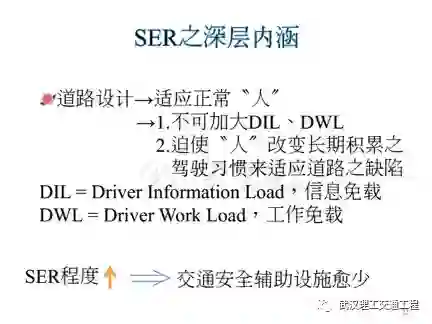 第二个就是Driver information load,你什么资讯什么信息要传给驾驶。所以我们常讲信息过载,就是这东西太多了,你给他标志太多,他看不了,就是信息过载。那么在就是driver work load,这个也是一样,这个是工作负载,什么意思?我开车的时候我的负荷量太大,这个路又弯,然后又陡,你给我的标志信息又多等等,所以你这是driver work load。所以说你看,我们如果这条道路如果是SER的话,你就应该怎么样?不可以加大DIL跟DWL,不能让他们的负载过大,要知道这种。