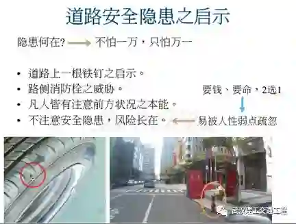 再看,我们讲安全隐患,安全隐患,这到底是什么意思?我们一般口语讲的不怕一万,只怕万一。我们看到道路上有一根铁钉,一个实际案例是有一个粗的钉子在高速公路上,几百部车子过去都没有车子压到,但是就是有一部倒霉的车主一过去就压上了,爆胎,他的车失控,这叫安全隐患,隐患在就是有风险在。你看这个路侧消防栓,你看这是台北,有一天你看这个消防栓是很要命,有一部车子稍微偏一下,就骑摩托车撞上消防栓了,人死了,然后这个消防栓断掉了,一直在喷水。他就是隐患了,大家都不去撞,但是总是有人会去撞。安全隐患,你看你如果不注重安全隐患了,你风险就是随时存在的,是不是?那么这个是我们常讲对人性弱点的忽视,因为很多人都不去注重的话,你会想他想说没有关系,我小心一点就是了,有这种想法。所以你看你是要钱还是要命,你自己挑,2选1,这里安全隐患。再看我们这里,我们讲为什么消防栓在那里可以存在那么久?道理很简单,因为凡是人在开车的时候,都有注意前方状况的本能,所以说人不会去撞,但是总有人有一天会不小心会撞到,知道这意思吗?这就属于安全隐患。所以说最根本之道就是把安全隐患给拿掉。