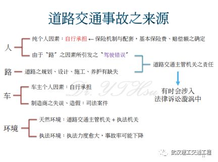 下面看这个,这个昨天也讲过。交通事故来源,交通事故来源可能是人,那么人可能是因为纯粹个人的因素,什么意思?他这个人喝酒了,或者是他的开车行为不好,他的开车习惯不好,那么怎么办?他自己要负责,要自行承担,但是我们看看如果某某人发生事故了,对不对?它虽然是要负责任没有错,但是从一个社会和谐立场,我们并不希望他的家庭破碎。