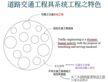 我们看这个图,你看,道路交通工程它是系统工程特色,为什么?因为它是一个这么大一个系统,这里面包括很多东西,很多个别的交通工程领域,比如说是做铺面的,做排水的,做照明的等等各个小领域,那么这个才是完整的,整个一个系统性工程。你看任何一个环节如果没有做好,他都是对安全是有损伤的。这里面不同的环节之间会有一些灰色地带,你看交通安全领域最容易被忽略的部分。好,我们举个例子,你看我把路面做好了,把护栏做好了,可是景观他要求说他要种树,可是他的树种不好就会影响安全。它是互相牵扯的,所以灰色地带是最容易被忽略的部分。也就是说你看不同交通工程领域的相互影响区,所以你看它是一个系统工程。你看这里有解释到什么是交通工程? 你看他是个dynamic human activity,看到没有,是动态的,人类的一种服务的行为,那么交通工程的目的是干什么?他的目的就是能够对人类有帮助,它是服务人类。当然我们在国内做交通工程服务的当然是我们国家自己的老百姓,一样是这里面有很大的意义的。