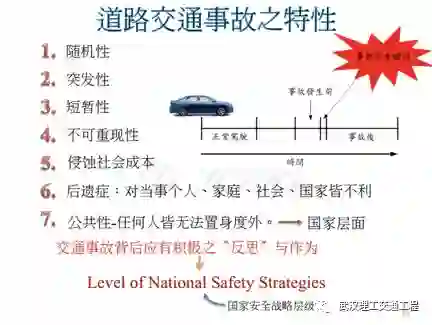 这个事故一定是突然发生的,它的发生只有几秒钟时间,十几秒就结束了,但是伤亡惨重。再来你看,事故发生时间很短,而且不可重现。你怎么样去重现事故当时的状况,只有一个方法,怎么弄?就做事故重建。但是事故重建又是一门大学问,我们怎样去了解到事故,当时他是怎么发生,那就是所谓事故重建。我在美国上过课,他的确是那种必须要思考的地方,比如像什么?当两部车子相撞的时候,当时为什么是这样子撞?为什么是那样子撞?那么撞的时候,这个车底凹陷多少,人的行为?这所谓的reconstruct事故重建。再看看交通事故会侵蚀社会成本,我们刚讲过美国的交通事故造成的伤亡,社会成本损失,每年2300亿美金,对不对?它就是一个社会成本,那么2300亿美金如果是把它省下来,你看可以做多少事?它会侵蚀社会成本。 社会成本你可能没有概念,我们举个例子,今天我们如果礼拜天,我们全部人都走到街上去散步,结果交通打乱了,结果没有人得到好处,大家忙成一团。那就是说也没有进账,但是大家都无谓的消耗,那就是侵蚀社会成本,但是会有后遗症。它的后遗症你看对当事人还有家庭、社会、国家都不利,尤其是对当事人,有些当事人他是缺了一只手、缺了一只脚,看到没有,生存竞争力,他得有心理阴影,然后他的家人也是一样的。然后这个社会要不要帮助他?要的,因为他变成残疾。那么这些变成了对国家的一个负担,所以说会有后遗症。再来是公共性,什么是公共性?任何人都无法置身度外,OK所以你看如果路做的不好,每一个人的机会都平等的,只要你有在这个地方生活,谁都可能碰到过。所以说你看,你从公共性来看,它是国家层面的问题,所以说你看我常常讲交通安全应该是什么?应该是国家安全的战略层级,你看strategy战略,国家安全战略群体一般有几个,一个是食品安全,我如果让我们的国民大量吃基因改造的食物,那么这个国家之后会被消灭的,为什么?你吃基因改造食物,这一代人不会怎么样,下一代的你就会产生出畸形的婴儿,你的智力就会退化,你的身体就有残缺,基因改造的食物,这就是食品安全,食安。再来就是交安,交通安全,交通安全对一个国家伤害是很大的。再是军事安全,我的国家我不能让别的国家来打我,军事安全。还有很多层次,但是食安、交安、军安就是一个国家前三名的国家安全战略。下面national safety strategies,这是国家安全战略层。那么这个东西当然是非常上位的,所以说我们的规范,我们的很多准则要把控好。标志标线,都是安全战略,是不是?你们可以看这个图,一部车是正常的驾驶,事故发生前在这里瞬间发生。你看前头,一个是天堂,一个是地狱,他就在瞬间,你看事故发生的瞬间。