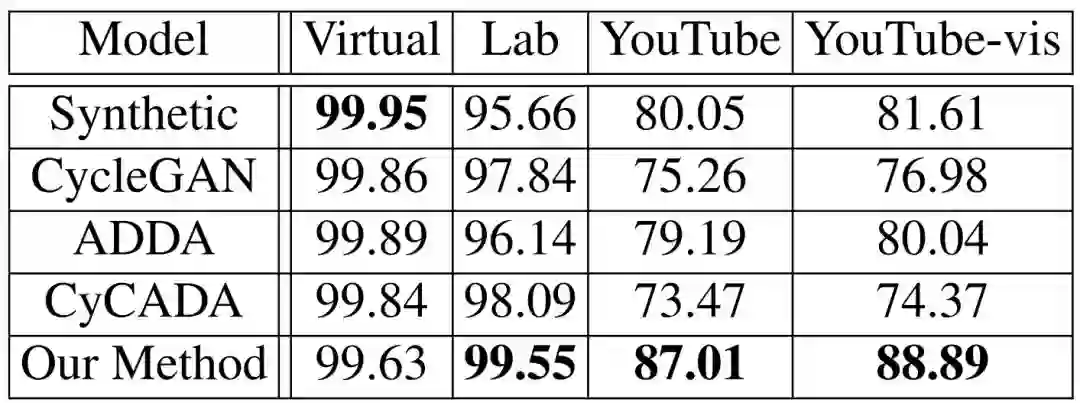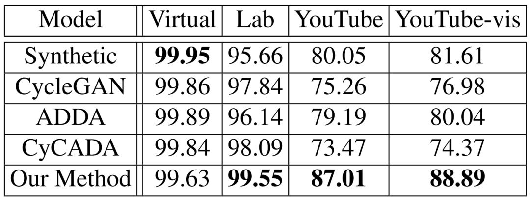 如下表所示,我们证明了在实验室环境下,我们提出的半监督域迁移算法(最后一行)相比于只使用虚拟数据训练的网络(第一行)性能有很大提升。且此方法优于其他的无监督域迁移算法,包括 CycleGAN[3] 等。参与对比的几种域迁移方法都以 Lab 数据集作为目标域。其在从未见过的 YouTube 数据上的准确率相对其他方法有更大提高,说明网络整体泛化能力获得提升。