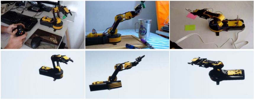 下图展示了三维重建的定性结果。上图是原始图片,下图是经过三维重建并渲染可视化的图片。可见,系统可以在复杂背景下对机械臂进行三维重建。实验室数据集上的定量结果表明,机械臂转角的重建误差约为 4.8 度。