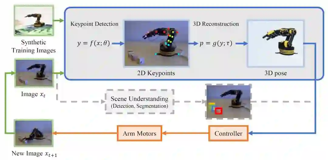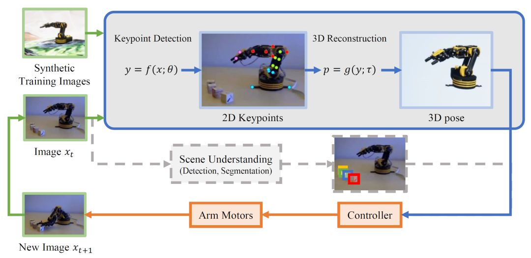 系统首先读入输入 RGB 视频流中的一帧(图中绿色部分),将其输入到姿态估计网络当中(图中蓝色部分),还原机械臂的三维姿态信息。最后,由强化学习智能体构成的控制器(图中橙色部分)接收三维姿态信息,生成控制信号,控制机械臂的电机运动。