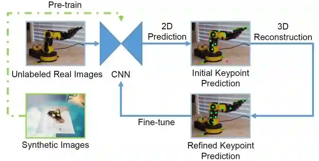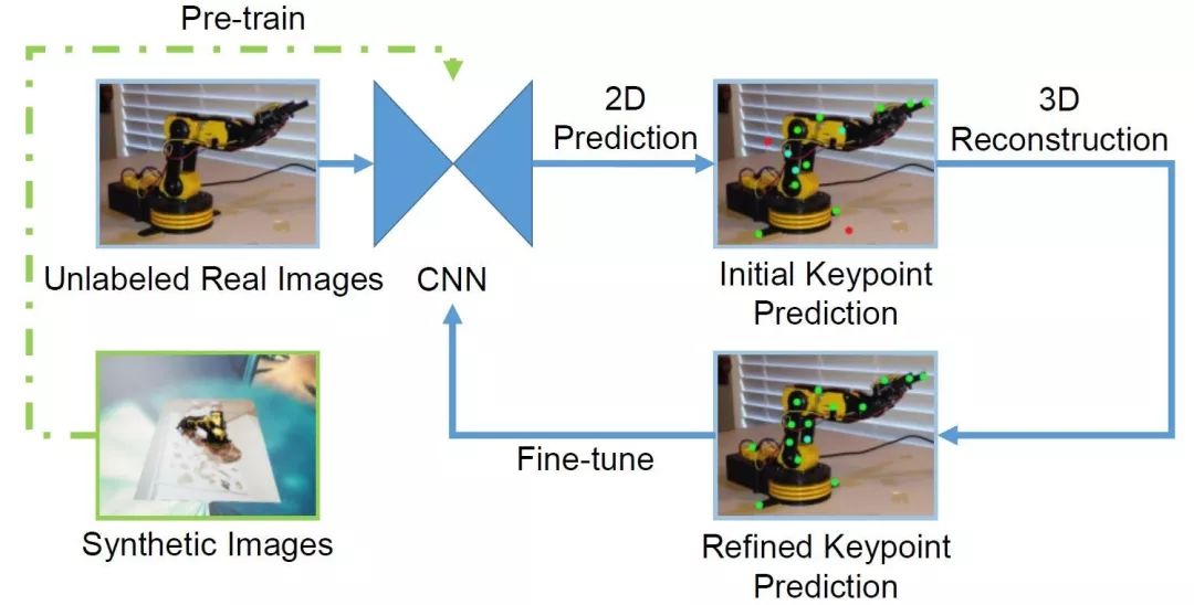 此外,我们提出了新的半监督域迁移算法。只使用虚拟数据进行训练的网络,在真实图片上的表现不够好,而采用了我们的算法之后,泛化性能有大幅度提升。下图展示了我们的域迁移算法框图。我们首先使用虚拟图片对神经网络进行预训练。之后,我们将没有标注过的真实图片送入网络,生成初始预测结果。由于域间的差异,初始预测结果可能会产生错误。我们基于初始预测结果进行三维重建,并将此结果投影回二维,就获得了优化后的关键点预测结果。由于在此过程中引入了机械臂刚性结构的强先验信息,所以优化后的预测结果会好于初始预测结果。最后,我们用真实图片及用这种方法生成的虚假标签来对神经网络进行微调。