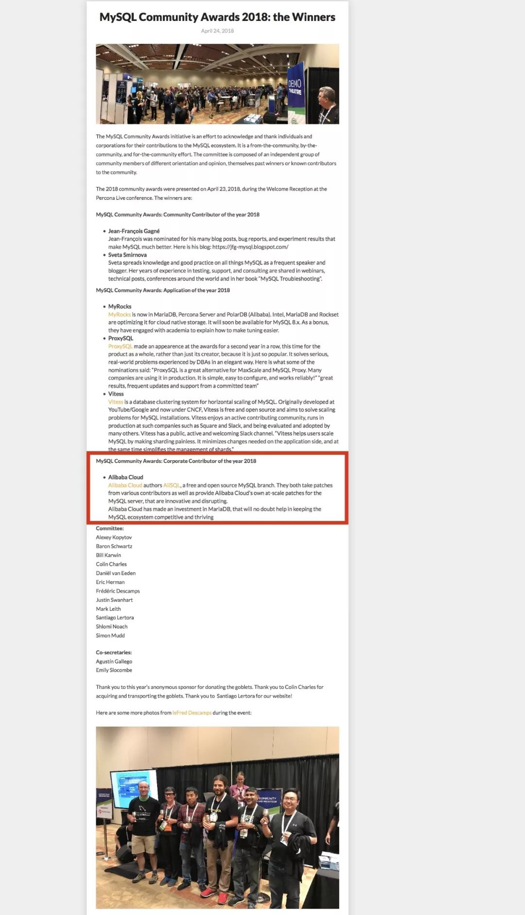 MySQL社区每年的Corporate Contributor Award奖项含金量极高。大家熟悉的Github,Facebook,Oracle,WebScaleSQL联盟都曾获此荣誉。
