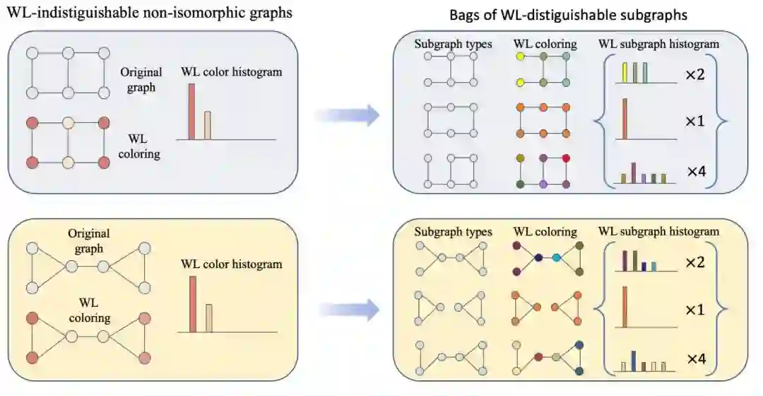 一直以来message-passing机制都认为是图神经网络的基本,但有时这种机制并不能完全通过WL同构图测试。在以往的工作中虽然有很多解决这个问题的方法,但作者认为他们都不够高效,消耗空间。因此,作者设计了一种新型等变子图聚合网络(Equivariant Subgraph Aggregation Networks ,ESAN)。大体思路是找到可区分的子图。对这些子图进行编码,可以发现这些编码能够产生更好的表达能力。这个区别可以通过下图示例表示:左边表示图无法通过WL测试。右边表示如果删除边得到一些子图,改变了图本身的结构,将这些结构看做包信息,这些包信息就能够极大区分图上的不同节点。作者认为一个图是可以看做由若干子图拼接出来的,因此最好的方法是设计一个同时能区分子图,又能融合这些子图的网络。ESAN的设计包括两个基本的结构,第一个是独立处理每个子图的孪生网络,第二个是一个信息共享模块,用来做子图信息共享和聚合。其中,引出一个新问题,怎么去初始化这些被选择的子图?因此,子图选择策略也是一个重点。