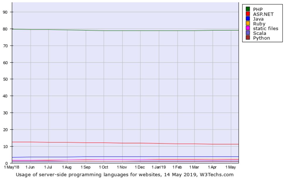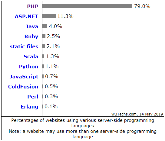 上图反映了 W3Techs 所统计的网站服务器端使用的编程语言情况(注:网站的服务器端可能不止使用一门编程语言)。可以看到,79% 的网站都用到 PHP 进行服务器端的开发,位居第一。而这个数字之于排名第二第三的 ASP.NET 和 Java 分别为 11.3% 和 4.0%,被 PHP 远甩身后。
