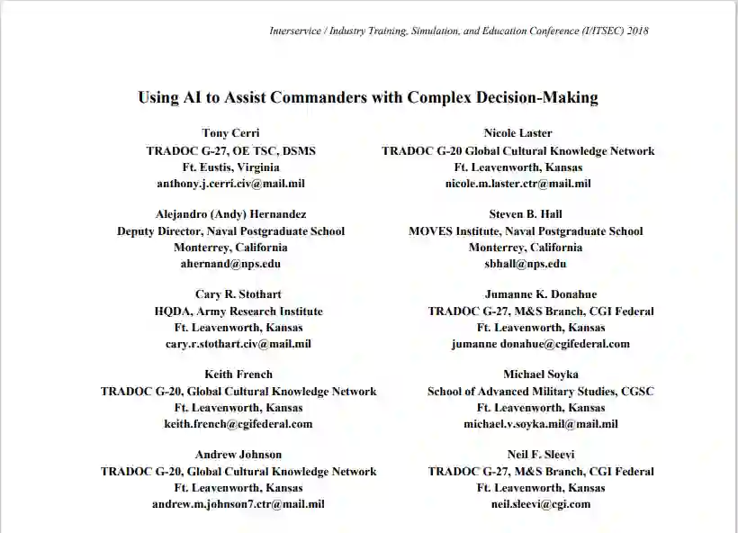 对美国陆军来说,加快投资以支持任务指挥部的决策过程(包括战略思考),是至关重要的。对手在针对美国及其合作伙伴的行动中使用机器学习和人工智能(AI)的速度令人严重关切。美国陆军卓越任务指挥中心认为,人工智能是 "真正的助手,在支持作战过程的同时帮助理解作战环境(OE)"。在快速移动的高度复杂的作战行动中,人工智能可能特别有用。本文的目的是确定一个规范性的政治、军事、经济、社会、基础设施、信息、物理环境和时间(PMESII-PT)模型,结合一个推荐系统,是否可以改善战略预见和决策。这样一个模型将使指挥官能够更好地可视化潜在的战略和战术,从而防止或减轻严重的反文化和道德问题。本文提出一个实验方法,比较了有无推荐系统的指挥官决策。其利用了多层次的场景,因此,拟议的实验结果可以为投资推荐系统提供成本定位。最后,研究了此推荐系统是否可以提高指挥官在多文化环境中关注有形资产和无形资产的能力。